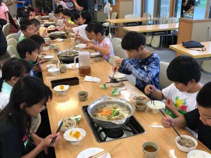 林間学習初日の夕食は、鴨鍋。これがおいしいのです。普段は少食の子も、みんなで囲む鍋が楽しいのか、どんどん箸がすすみました。