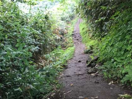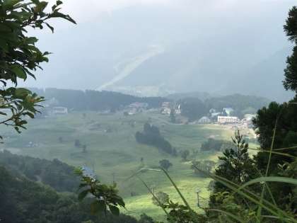 尾根道が終わり、頂上手前は、草木が茂る一本道。ある男の子は、先が見えずにくじけそうになりましたが、偶然下界の景色を見つけ、思わず「すげぇ!」元気が出てきました。