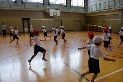 はじめに集まっていた場所から一度へスキップをして広がり、別の場所に先生が立った所へ、集まります。このときに、並び方を覚えているか、どきどき!!