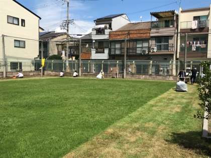 夏休み中に伸びた芝や草を、地域のシニアクラブのみなさんが、きれいに刈ってくださいました。この日は、大変厳しい残暑で、大量の汗をかきながら、作業を続けていただきました。子どもたちのために、本当にありがとうございました。
