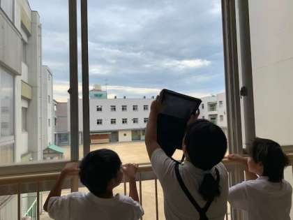 「雲と天気の変化」の学習で、雲の様子を観察しています。グループで協力して、今日一日の雲をタブレットで撮影しました。