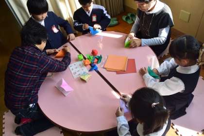紙ひこうき、けん玉、折り紙、こま、あやとりを楽しく教えてもらいました。