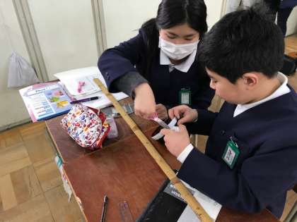 具体的な物を使い、友だちと協力しながら、長さを測っていきました。