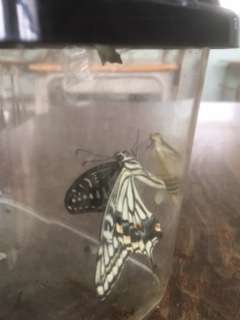 2.今朝学校に来てみると、さなぎからアゲハチョウになっていました。中からぬけ出したさなぎのからにとまって羽をかわかしています。