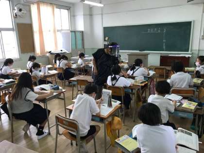 写真は5年生と3年生。国語辞典で意味調べをしました。
