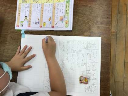 1年生はひらがな、2年生は漢字の学習です。筆順を覚え、丁寧に書いています。これからもずっと、よい姿勢で書いていってくださいね!