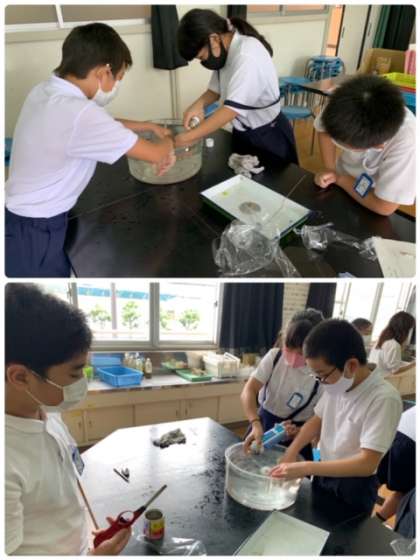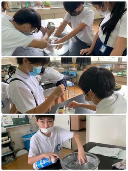 「ものが燃えるしくみ」の学習をしています。今日は、『水上置換法』で気体をビンに集め、『窒素』『酸素』『二酸化炭素』の中で、ろうそくと線香がどのように燃えるかの実験をしました。