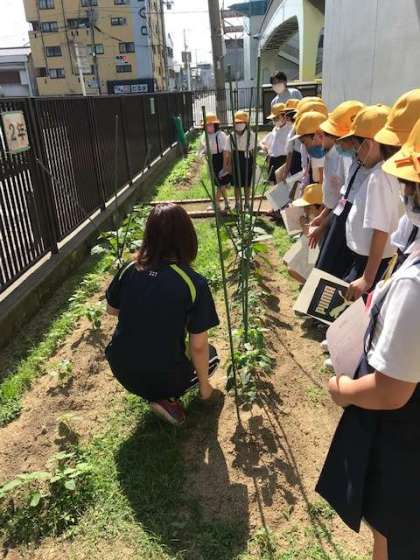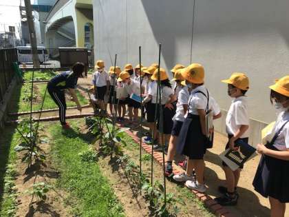 もうひとつのクラスは、学習園に行きました。太陽をいっぱい浴びた、トマト、オクラ、枝豆、ナスなどを観察し、生育状況をスケッチしました。