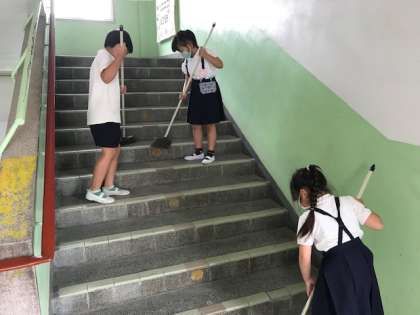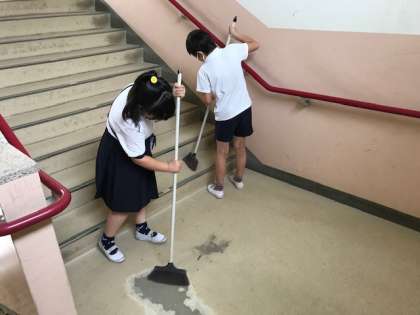 昼休みにたくさん遊んだあとは、掃除の時間です。外で遊ぶ人がたくさんの南恩加島小学校では、ろうかや階段に砂があがりやすいです。限られた時間で、みんなが気持ちよくなるよう、丁寧に掃除していました。(写真は、2・3・4年生)