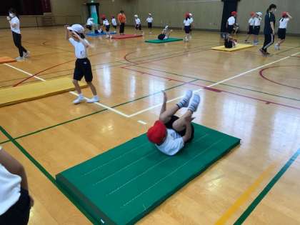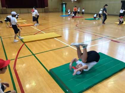 前転と後転を学習しました。手の付き方や回る速さ、起き上がりの姿勢に気を付けて練習しました。どの子どもも、楽しく取り組んでいました。