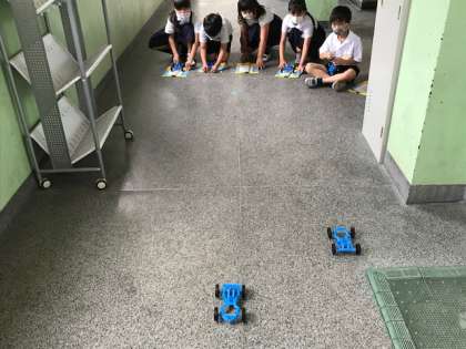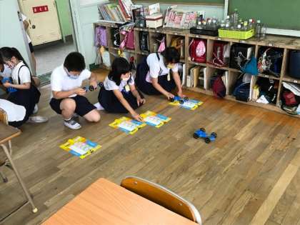 グループに分かれて実験の続きをしました。速やかに場所を移動し、さっそく開始しました。ゴムの引き具合と車の走る距離の関係を確かめながら、友だちと楽しく実験をしました。
