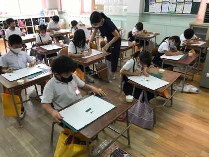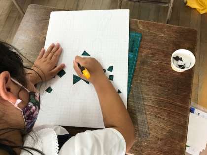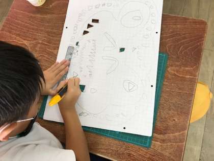 カッターナイフを使っての学習です。「刃は少しだけ出す」「ゆっくり動かす」「刃をしまってから置く」などに気をつけながら、くりぬいていきました。作品完成まで、楽しく学習してください!