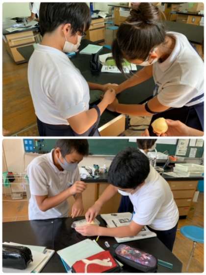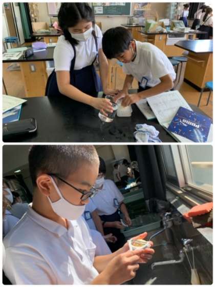 みんなが身近に食べている中で、でんぷんが多く含まれているものって・・・?答えは『じゃがいも』です。今日はそんなじゃがいいもから、でんぷんを取り出す実験をしました。皮をむいて、すりおろして、こし出して、しばらく待っているとビーカーの下に白いものが溜まっています。それを取り出して、ヨウ素液を垂らすと、青紫色に!無事にでんぷんが取り出せた証拠です。実験は大成功でした!