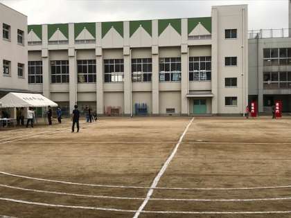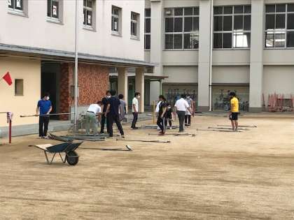 この日は、職員が運動場にトラックのライン引きをし、本部のテントをたてました。