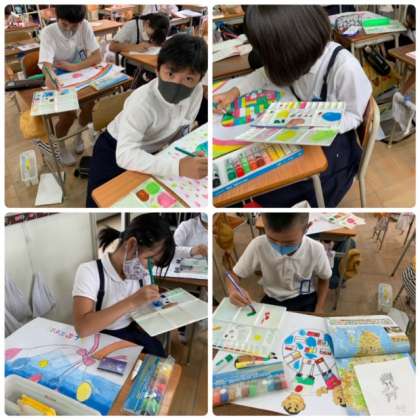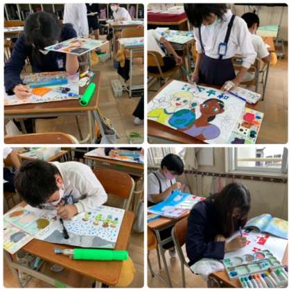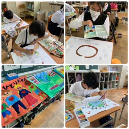 『人権』について考え、考えたことをポスターにしています。「いじめをなくそう」「差別をなくそう」「平和な世界にしよう」と様々なポスターができあがってきました。