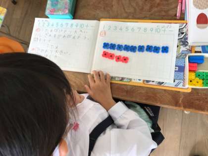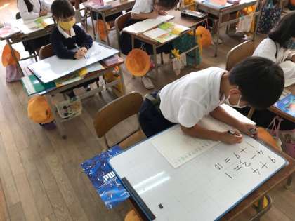 ホワイトボードに書いたり、前で発表したりすることで、みんなで考えながら「10のまとまりをつくる」ことを理解していきました。