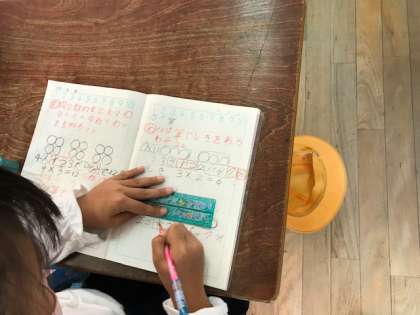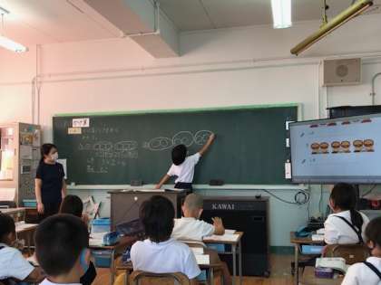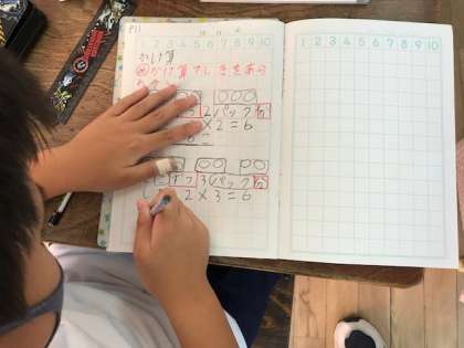 ノートに図をかき、「1つ分の数」と「いくつ分」から、かけ算の式をつくっていきました。前で発表するのも、だんだん慣れてきました。