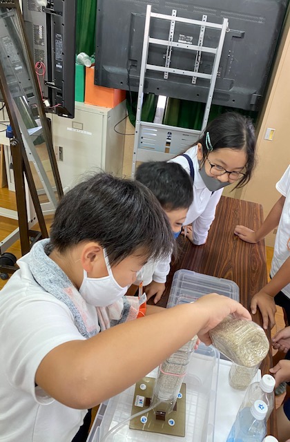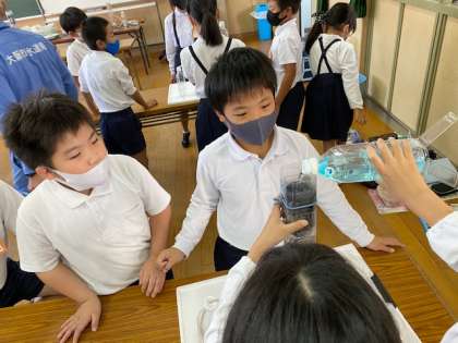 安全な水が家庭に届くまでにたくさんの工程があること、砂ろか、活性炭で色とにおいを取る実験など楽しく学ぶことができました。