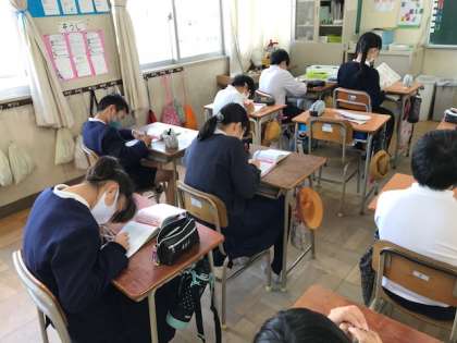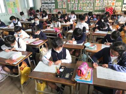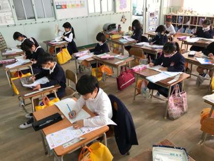水曜日朝の15分間、一斉に取り組んでいます。この日、1年生は、計算ドリルを見て式をノートに写しながら計算しました。