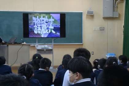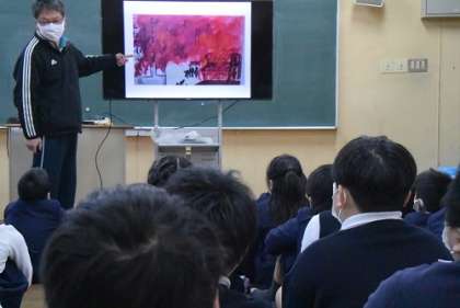 4年生は、まず、戦争中の大阪の街の写真や空襲の様子を描いた絵の写真を見ました。