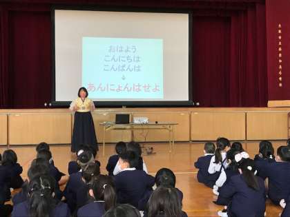 1年生は、ことばや着る物、食べる物などについてクイズに答えました。昔話(民話)では、日本なら「むかしむかし、おじいさんとおばあさんが…」と始まりますが、韓国・朝鮮では、「むかしむかし、まだホランイが○○だったころ」と始まる話が多いことを知りました。ホランイとは、トラだと知り、新たな発見となりました。