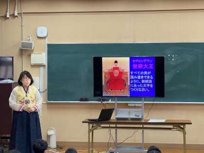 韓国朝鮮語には、日本語とよく似た発音があることや、逆に韓国朝鮮語独特の発音があることをクイズ形式で楽しく学習しました。