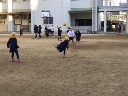 右の写真は、1年生がドッジボールをしているところです。自分たちでコートを引き、少人数でも楽しく遊んでいます。微笑ましい光景です。