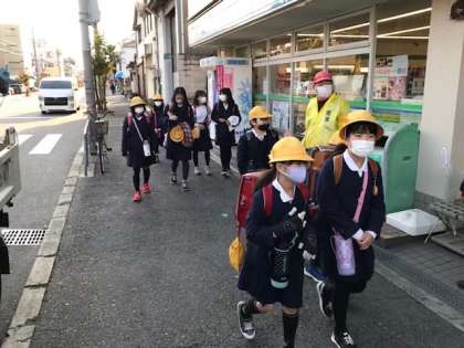 学校まで距離のあるこの地点では、横断歩道を渡った子たちが待ち合わせをし、大きなかたまりとなって移動を始めます。