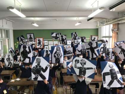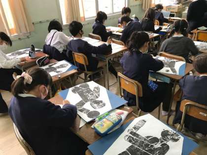 版画の印刷を終え、台紙に貼ったり、名札を書いたりしました。