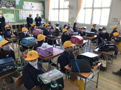 高学年の児童がまず1年生を迎えに行き、1年の移動が済んでから、他の学年の児童が地区別の教室に移動しました。