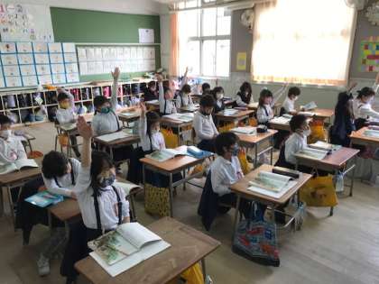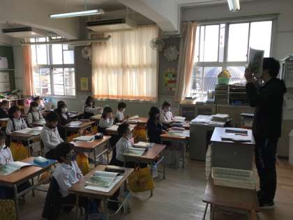 先生の話で、前の時間に学年したことを思い出し、今日の学習のめあてを確認している場面です。