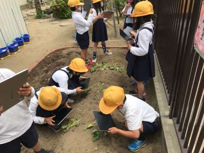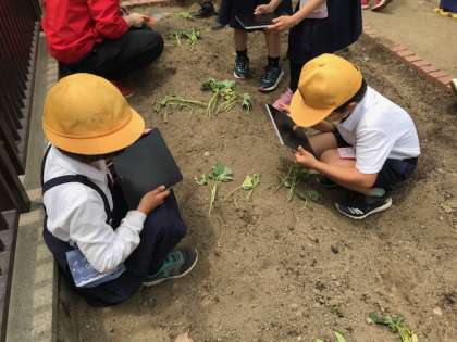 サツマイモの苗を植えました。成長の様子を記録するために、タブレット端末で撮影しました。