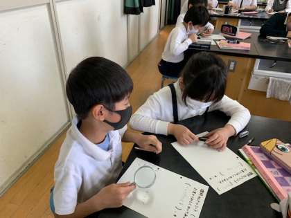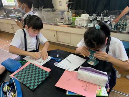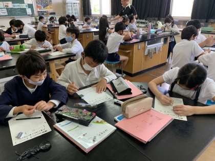 ヒョウタンの種を観察しました。虫眼鏡や顕微鏡を使って、種の形や色や感触などをくわしく調べました。集中してじっくりと観察し、気づいたことをワークシートにまとめることができました。スケッチもとても上手でした。