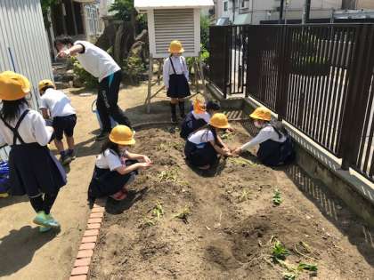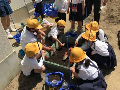 この時間は、土に腐葉土を混ぜ、一人一人の鉢に入れてから苗を植えました。