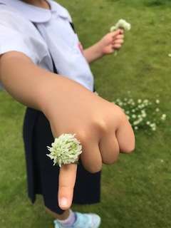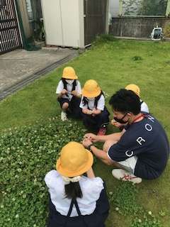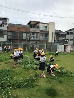 第二運動場に、たくさんのシロツメクサが咲いていました。