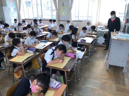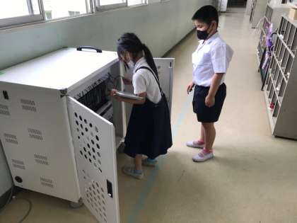 書けた子どもから、明日の「オンライン学習」のためのタブレットを取りに行きました。