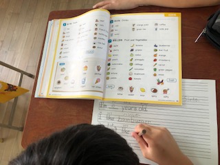 英語の教科書にあるイラストから、好きな食べ物や動物などを選んでいきました。