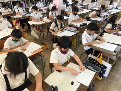 写真の男の子は、たった一人で図書館に行き、補助員の先生に聞きながら積極的に調べていました。