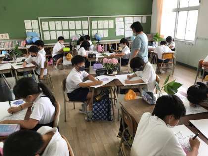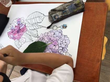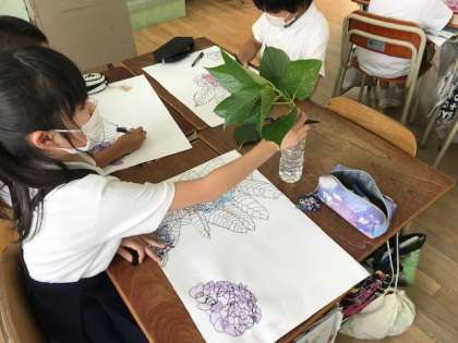 この時間は、学習園から葉っぱを教室に持ち込み、よく観察しながら、サインペンで描きすすめました。