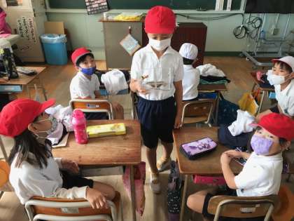 朝の会では、男の子が、虫かごをそうっと持ちながら、みんなに見せていました。