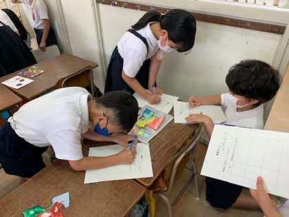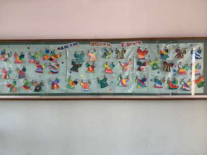夏らしい4年生の玄関掲示が完成しました。指を使って色を付け、一人一人の個性あふれたTシャツが完成しました。完成した作品をみんなで鑑賞しあい、洗濯物のようにつるして飾りました。素敵な作品が完成しました♪