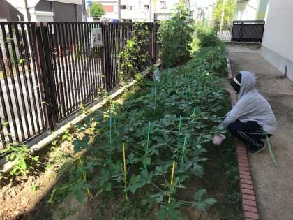 真夏の太陽のもと、サツマイモやオクラが元気に育っています。