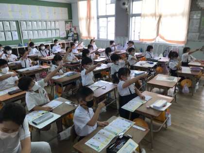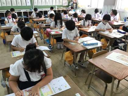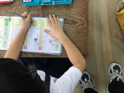 みんなで筆順を確認したあと、自分のドリルでもう一度確かめながら