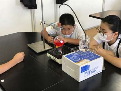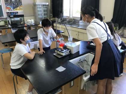 蒸発した水蒸気が、ゴム管を通って冷やされ、ビーカーに溜まっていく