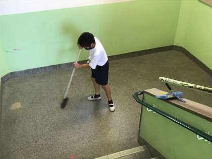 写真は、5年生の3人。それぞれ階を分担して、1人で黙々と