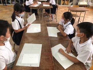 次に司会が中心となって話し合いをします。カードにを並べてみて、仲間分けをしました。その中から、いちばんいいと思った「合い言葉」を各グループで決めて発表しました。どのグループも、今、自分たちが頑張ろうとすることをよく話し合ってまとめていました。