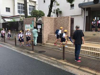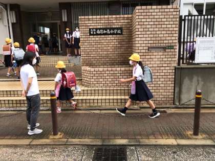 雨が上がり、少し空が明るくなる中、子どもたちが元気に登校して