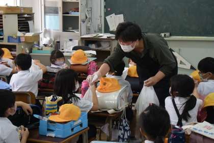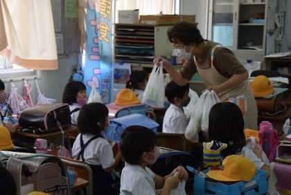 地域の皆さんから一人ずつ、袋を手渡してもらい、