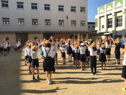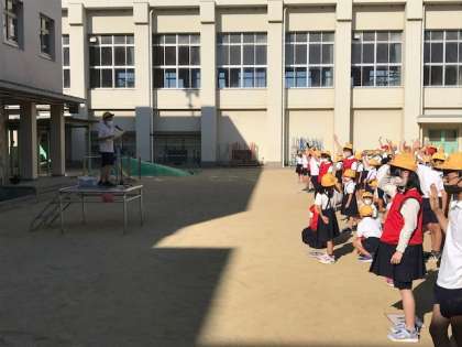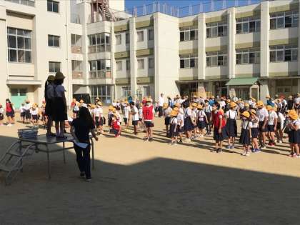 今日の集会は、久しぶりに、みんな運動場に集まって行いました。