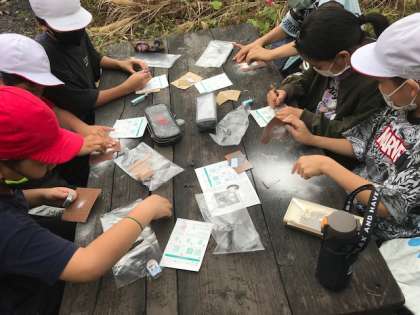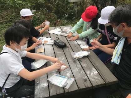 次の活動は『勾玉作り』です。石の角を丸くするため、サンドペーパーでいっしょうけんめい削ります。